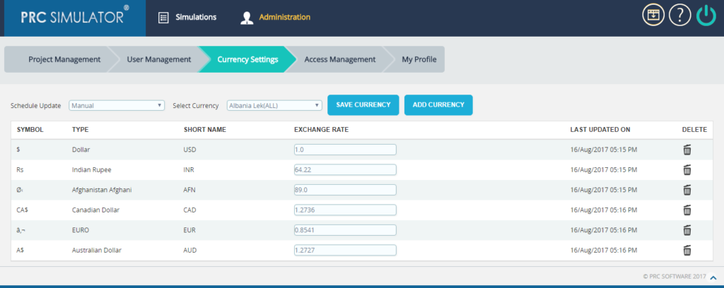 The Currency settings page is used to set the desired currency for the PRC Schedule Simulator application. This page can be viewed or edited only by the Super User.