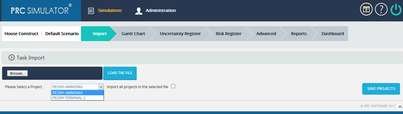 This functionality is used to select a project from the project list for which the tasks will be imported and also the scenario based on which the schedule simulation can be done.