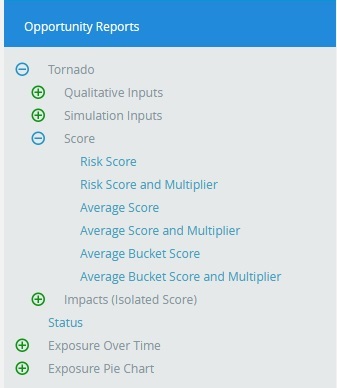The report option for threat and opportunity are Threat Tornado, Opportunity Tornado, Threat Exposure Over Time, Opportunity Exposure Over Time, Threat Qualitative Exposure Pie Chart, Opportunity Qualitative Exposure Pie Chart, Threat Simulation Exposure Pie Chart and Opportunity Simulation Exposure Pie Chart.